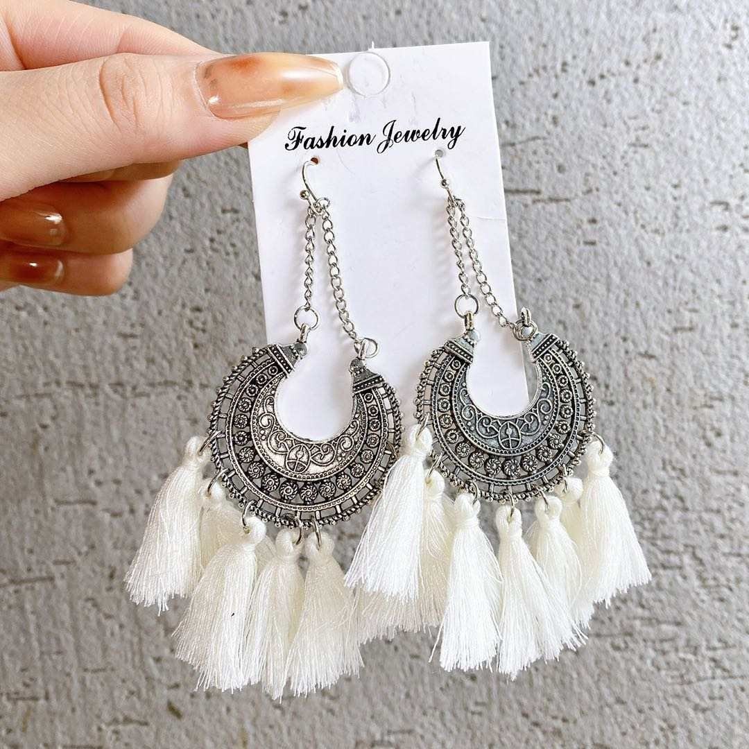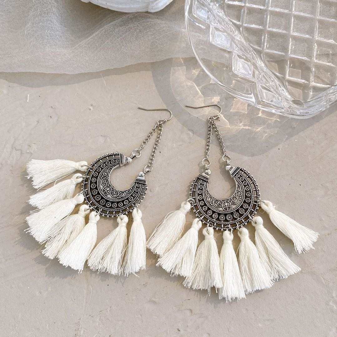 Tieto originálne Postriebrené visiace náušnice s bielymi strapcami v boho štýle sú skvelým doplnkom na leto aj špeciálne príležitosti. Kombinácia kovového detailu a jemných strapcov vytvára jedinečný a hravý vzhľad. Nikel-free zloženie zaisťuje pohodlné nosenie a trojitá galvanizácia garantuje dlhodobý lesk.