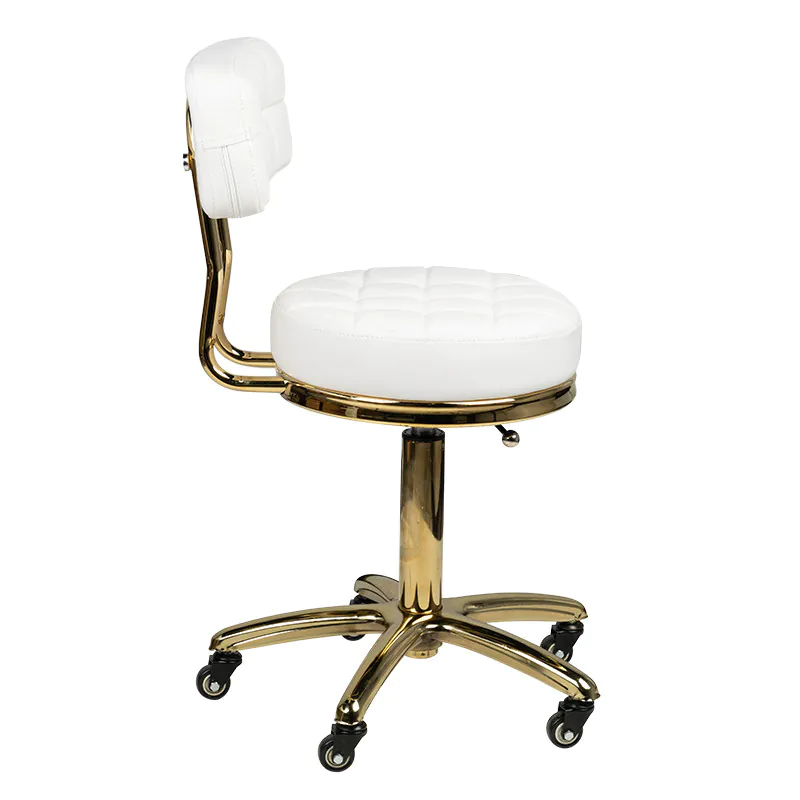 Jedinečná kozmetická stolička v bielej farbe s prešívaným sedadlom a pohodlným operadlom. Kovové prvky sa nádherne lesknú v zlatej farbe. Je výškovo nastaviteľná a má robustnú kovovo-gumovú základňu s pevnými kolieskami. Lakované kovové povrchy.