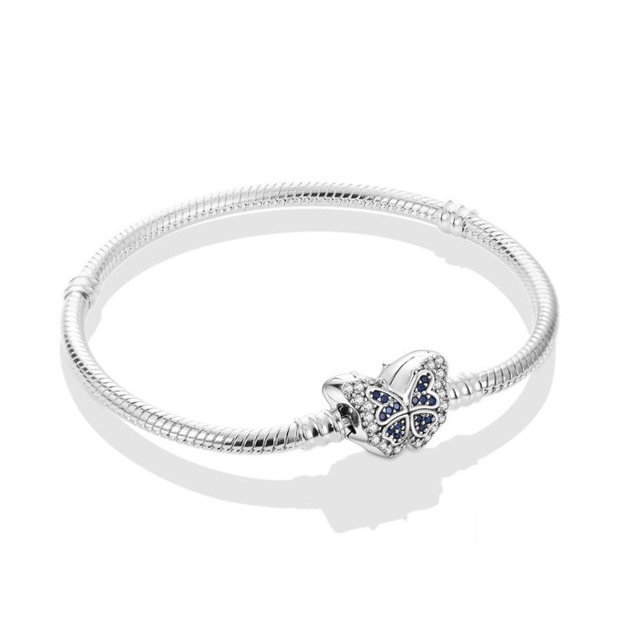 Modulárny náramok Motýľ so zirkónmi je vyrobený z pravého striebra rýdzosti 925 a spája eleganciu s jemnou symbolikou premeny a slobody. V strede zapínania sa nachádza detailne spracovaný motýľ zdobený modrými a čírymi kubickými zirkónmi, ktoré sa krásne trblietajú pri každom pohybe. Motív motýľa predstavuje nový začiatok, slobodu a vnútornú silu, vďaka čomu má náramok nielen estetický, ale aj osobný význam. Lesklý strieborný povrch harmonicky kontrastuje s hlbokými tónmi modrých zirkónov. Mäkký hadí vzor zabezpečuje pohodlné nosenie a umožňuje jednoduché dopĺňanie príveskov podľa vlastného štýlu.