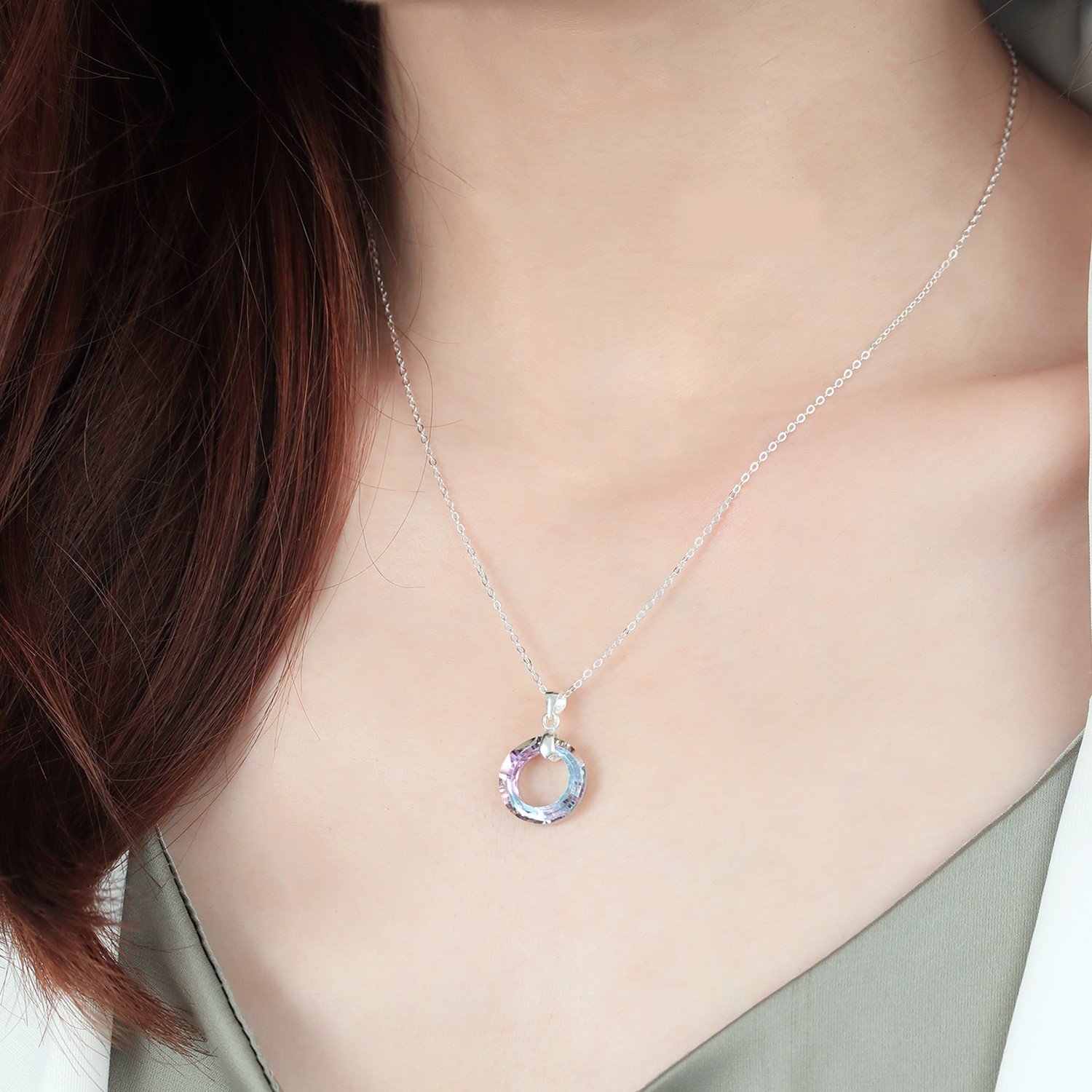 Jemný a elegantný náhrdelník zo striebra rýdzosti 925 s príveskom v tvare fasetovaného kruhu z opalizujúceho krištáľu.