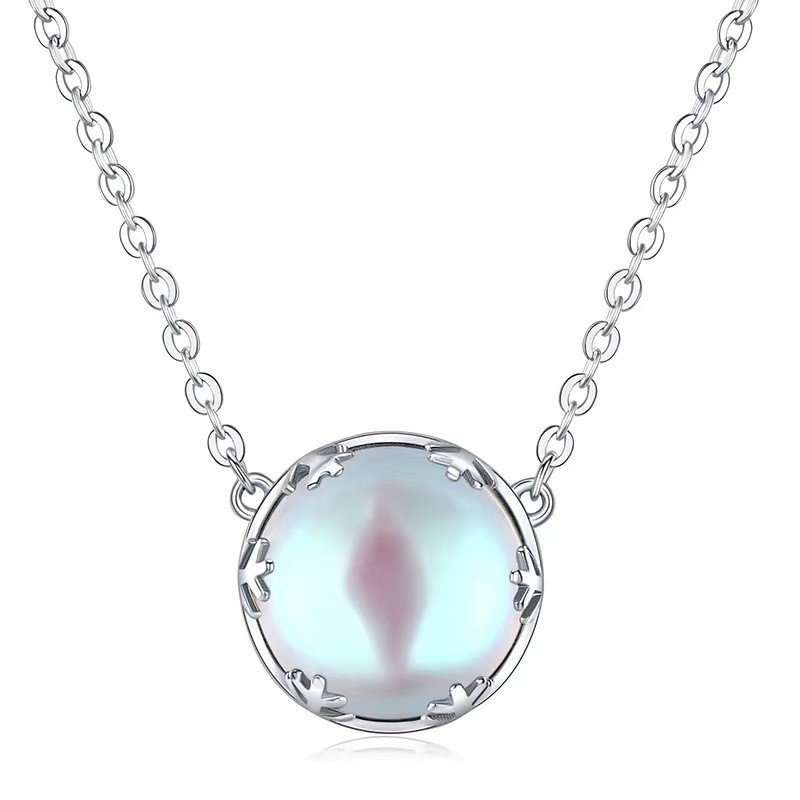 Jemný a ženský náhrdelník z pravého striebra rýdzosti 925 s príveskom v tvare kruhu zdobeným opalizujúcim mliečnym kameňom. Kameň s hladkým povrchom sa nádherne trbliece v tónoch modrej, mentolovej a ružovej, pričom vytvára jemné svetelné odlesky pri každom pohybe. Prívesok je zasadený do filigránovej striebornej obruby s detailom drobných lístkov, ktorá mu dodáva ľahkosť a prirodzený šarm.