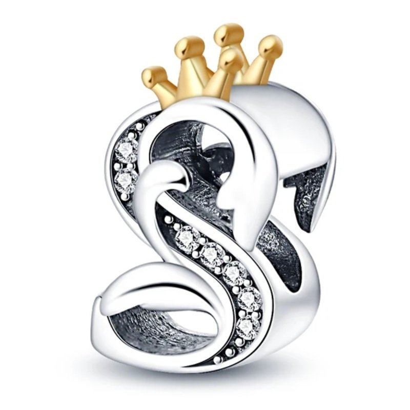 Prívesok s písmenom S je elegantným personalizovaným doplnkom vyrobeným zo striebra rýdzosti S925. Písmeno je bohato zdobené trblietavými kubickými zirkónmi, ktoré dodávajú šperku luxusný lesk, a v hornej časti je doplnené zlatou korunkou, symbolizujúcou kráľovský štýl, výnimočnosť a sebavedomie. Tento prívesok je ideálny ako osobný šperk s iniciálou, darček so špeciálnym významom alebo výrazný detail do kolekcie modulárneho náramku. Prívesok je určený pre modulárne náramky so štandardným otvorom. Súčasťou balenia je šperková visačka a k dispozícii je aj možnosť darčekového balenia.