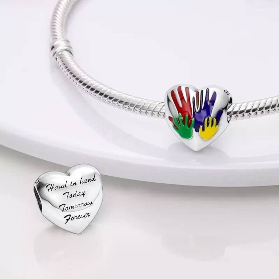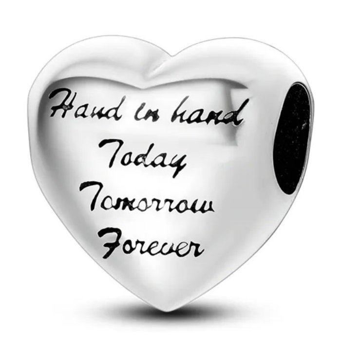Prívesok Ruka v ruke je jedinečný šperk vyrobený zo striebra rýdzosti 925, ktorý nesie silné emocionálne posolstvo lásky, jednoty a spolupatričnosti. Motív farebných rúk symbolizuje podporu, blízkosť a trvalé puto medzi dvoma ľuďmi. Na zadnej strane prívesku sa nachádza vyrytý nápis „Hand in hand, Today, Tomorrow, Forever“, ktorý ešte viac prehlbuje jeho význam a robí z neho krásny osobný talizman. Vďaka univerzálnemu otvoru je prívesok kompatibilný s väčšinou modulárnych náramkov a skvelo doplní romantickú aj symbolickú kolekciu šperkov. Je ideálnym darčekom pre partnera, blízku osobu alebo ako pripomienka trvalého puta.